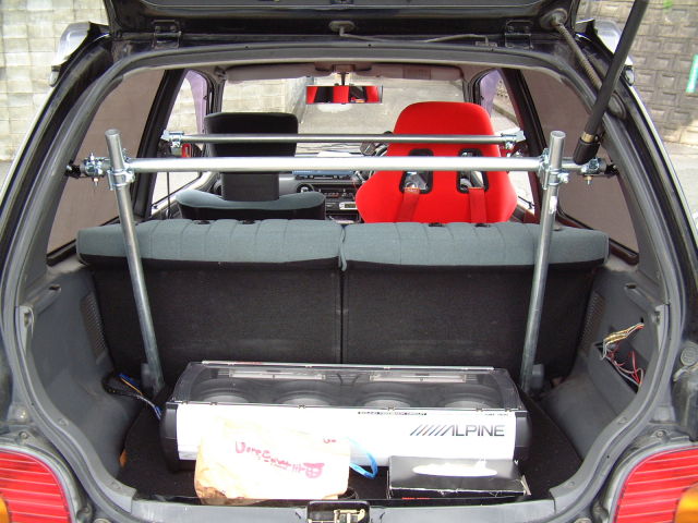 ↓助手席側外から撮影。もう後部座席は使えません(笑) とかいいつつ、いつでも外せるようにラチェットを常備してます。
