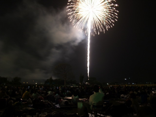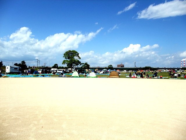 花火会場横の駐車場着11:30。早く着いたのか駐車場や周辺道路はまばら。