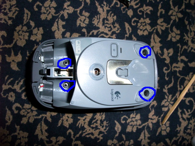 ↓青丸の4ヶ所にネジがあります。1.5mmの六角レンチで外してください。ていうか、六角なんか使ってんじゃねーよ!