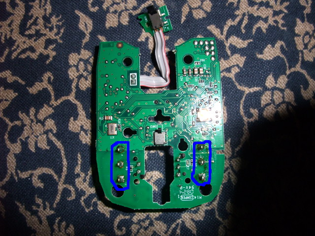 ↓裏返しました。青丸部分がマイクロスイッチをはんだ付けしたところです。